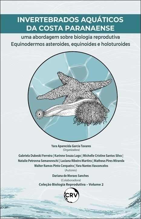 Assunto: INVERTEBRADOS AQUÁTICOS DA COSTA PARANAENSE – UMA ABORDAGEM SOBRE BIOLOGIA REPRODUTIVA: Equinodermos asteroides, equinoides e holoturoides Yara Aparecida Garcia Tavares (Organizadora) Gabriela Dubeski Ferreira Karinne Souza Lugo Luciana Ribeiro Martins Michelle Cristine Santos Silva Natalie Petrovna Semanovschi Matheus Pires Miranda Walter Ramos Pinto Cerqueira Yara Nantes Vasconcelos Dariana Sanches de Moraes (colaboradora) I62 Invertebrados aquáticos da Costa Paranaense – uma abordagem sobre biologia reprodutiva Equinodermos asteroides, equinoides e holoturoides Yara Aparecida Garcia Tavares (organizadora), Gabriela Dubeski Ferreira, Karinne Souza Lugo, Michelle Cristine Santos Silva, Natalie Petrovna Semanovschi, Luciana Ribeiro Martins, Matheus Pires Miranda, Walter Ramos Pinto Cerqueira, Yara Nantes Vasconcelos (autores), Dariana de Moraes Sanches (colaboradora) – Curitiba CRV 2023 78 p; (Coleção Biologia Reprodutiva, v 2) Bibliografi a ISBN Coleção Digital 9786525158655 ISBN Coleção Físico 9786525158648 ISBN Volume Digital 9786525160122 ISBN Volume Físico 9786525160139 DOI 10248249786525160139 ISBN Coleção Digital 978-65-251-5865-5 ISBN Coleção Físico 978-65-251-5864-8 ISBN Volume Digital 978-65-251-6012-2 ISBN Volume Físico 978-65-251-6013-9 DOI 10.24824/978652516013.9 1 Zoologia 2 Invertebrados aquáticos 3 Reprodução 4 Histologia 5 Recursos vivos critérios IUNC litoral do Paraná I Tavares, Yara Aparecida Garcia (org) II Ferreira, Gabriela Dubeski III Lugo, Karinne Souza [et al] IV Sanches, Dariana de Moraes (col) V Título VI Coleção Biologia Reprodutiva, v 2 CDU 592(8162) CDD 59098164